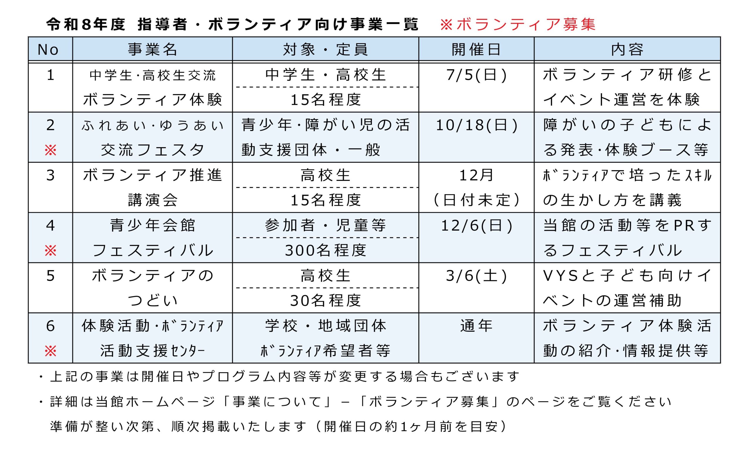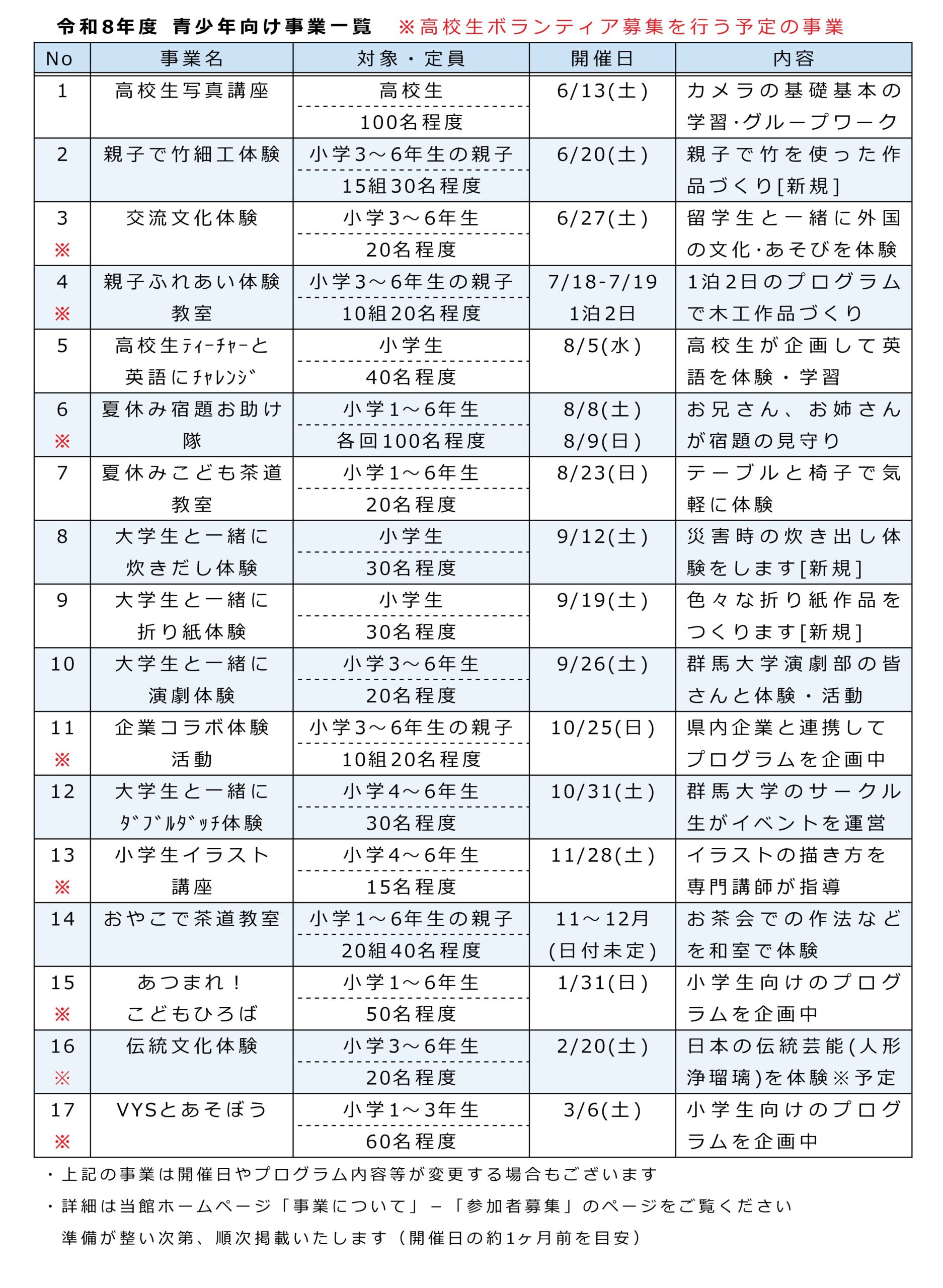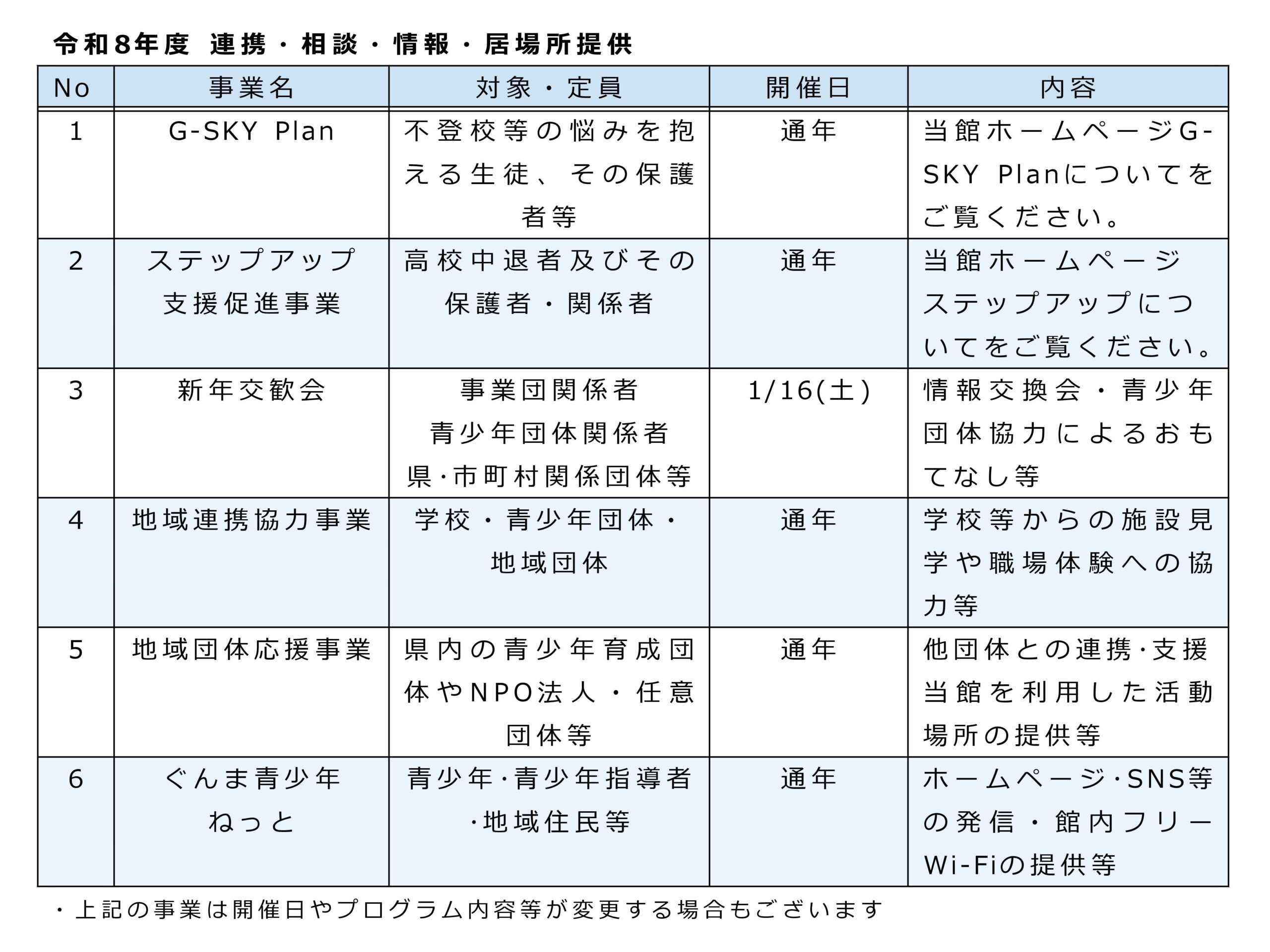 群馬県青少年会館 > 事業について > 事業一覧 事業一覧 青少年向け 青少年向け事業一覧(PDF) 指導者・ボランティア向け 指導者・ボランティア向け事業一覧(PDF) 連携・相談・情報・居場所提供 連携・相談・情報・居場所提供(PDF)