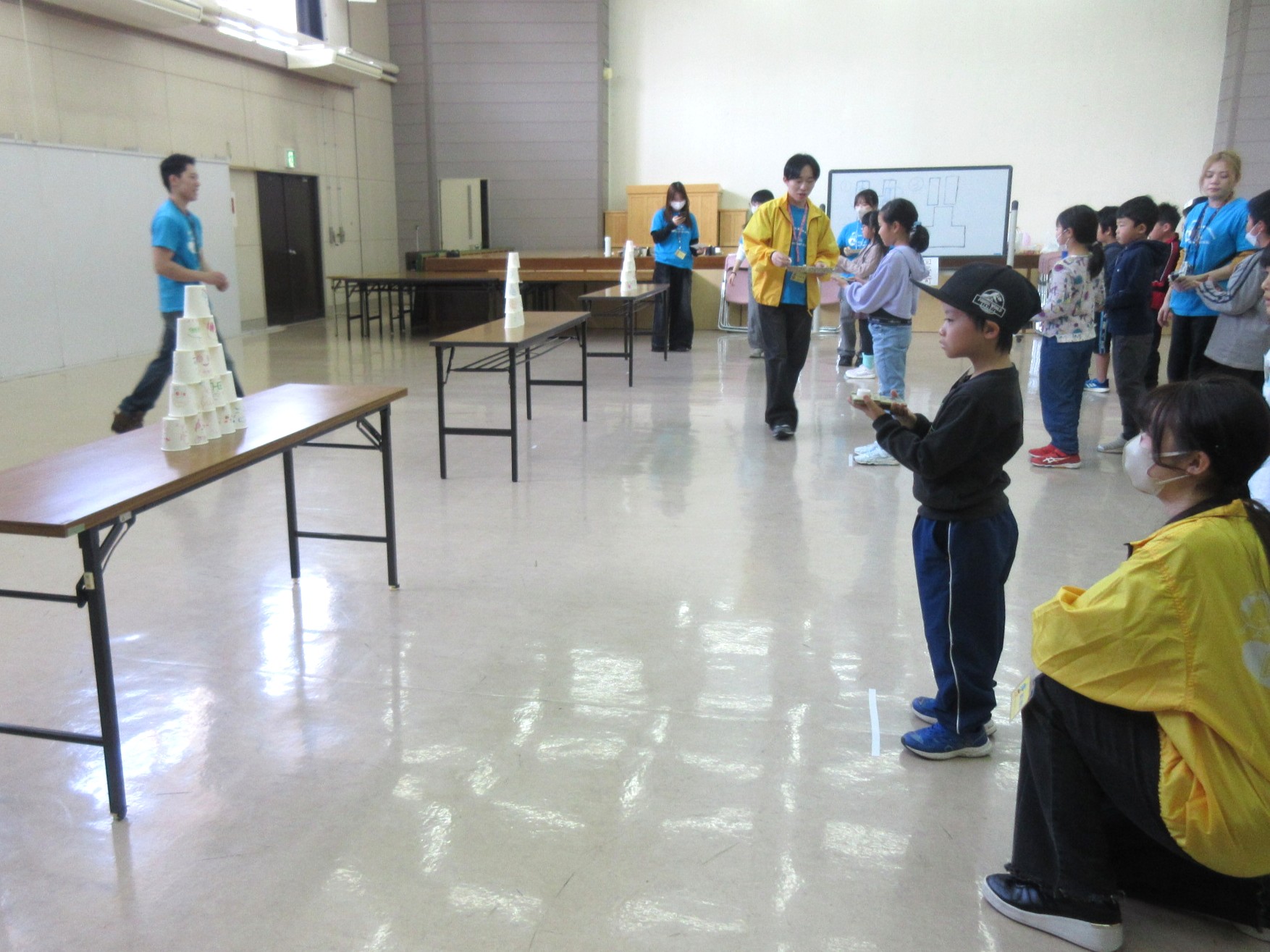段ボールとペットボトルのキャップで工作しました。チームごとに的あてゲームで遊びました。