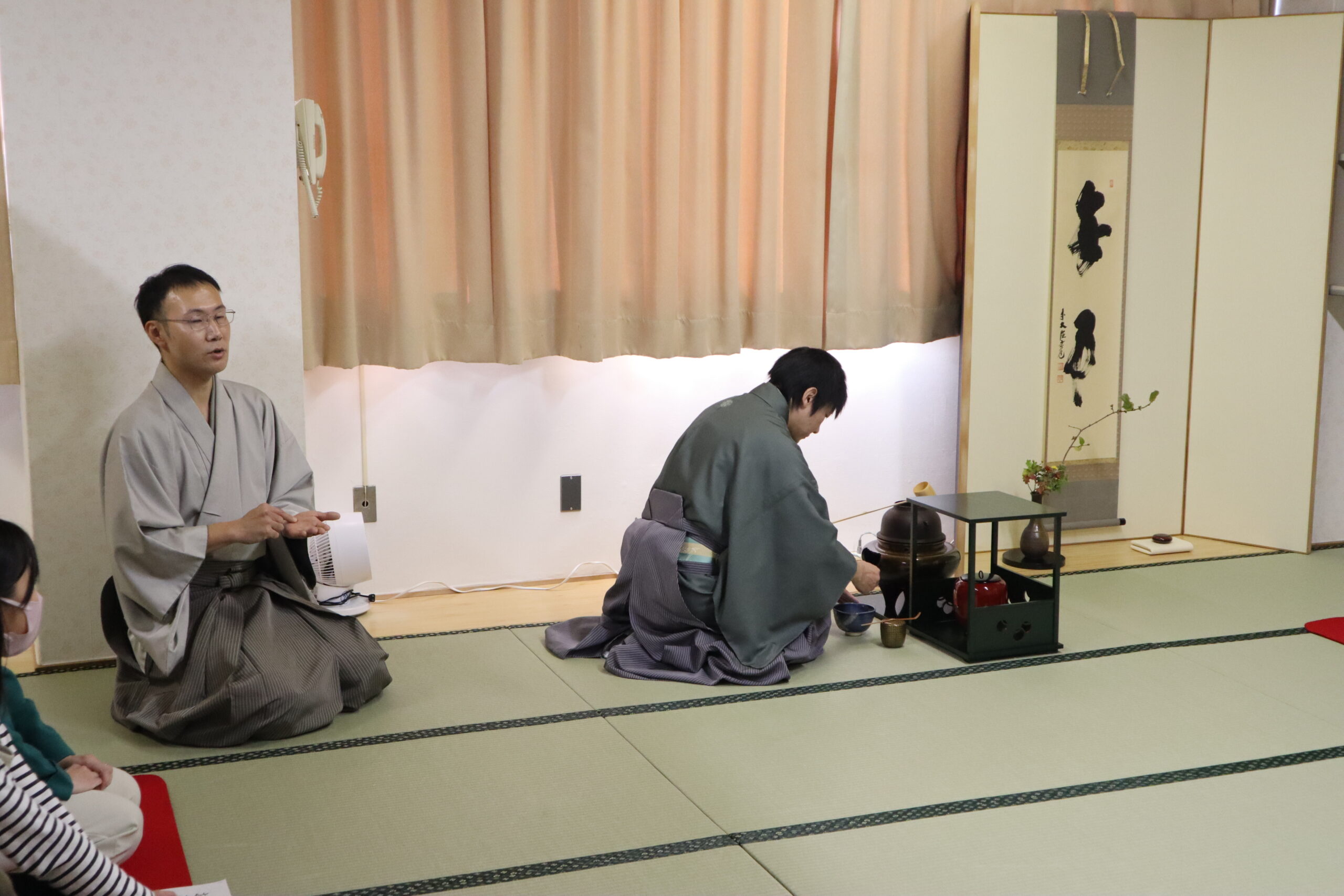 最初に先生のお点前を拝見し、お道具の説明から基本的な作法を学びました。